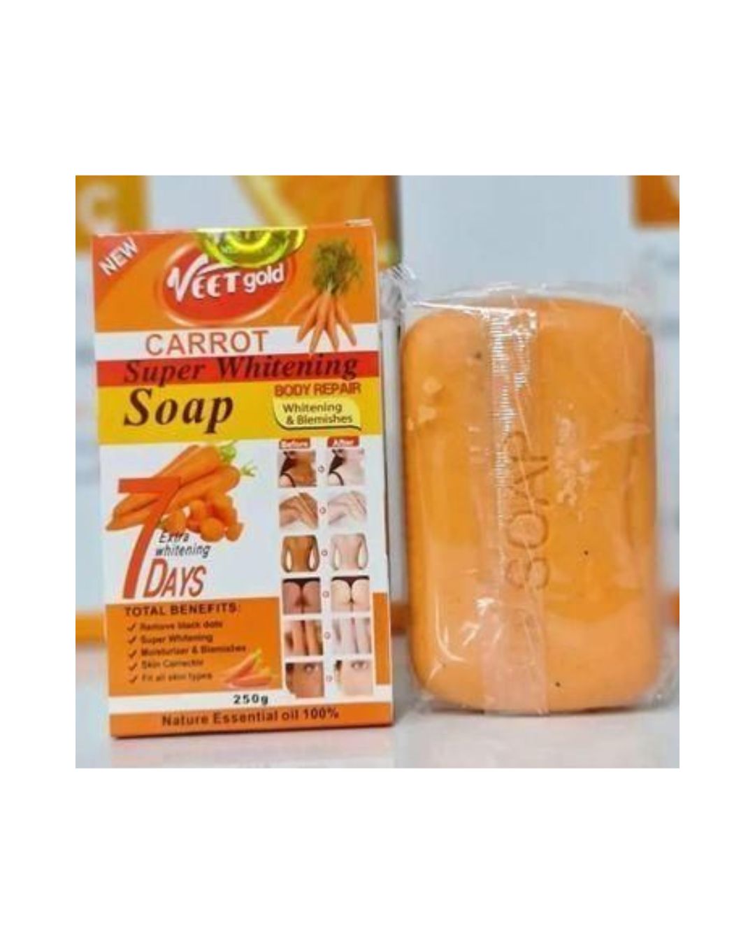 • Super Whitening: Veet Gold Carrot Super Whitening Soap is designed with people who want to see the results of a change in the skin color and radiance within a few hours.